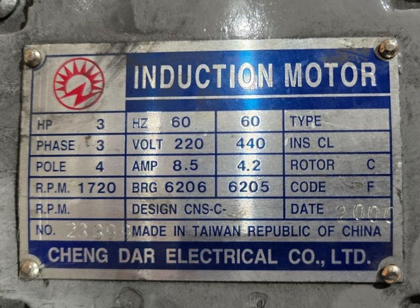 Cheng Dar Electrical induction motor, model 23399, rated at 3 horsepower and 1720 RPM. This is a robust, general-purpose motor suitable for powering machinery, pumps, conveyors, and other industrial equipment. The motor features a TEFC (totally enclosed fan-cooled) enclosure for added protection in dusty or dirty environments. Manufacturer: Cheng Dar Electrical Model: 23399 Power: 3 HP Speed: 1720 RPM Type: Induction Motor Enclosure: Likely TEFC (verify in photos) Application: Industrial machinery, HVAC systems, compressors, conveyors See photos for motor plate details and wiring configuration. Untested, Sold As-Is