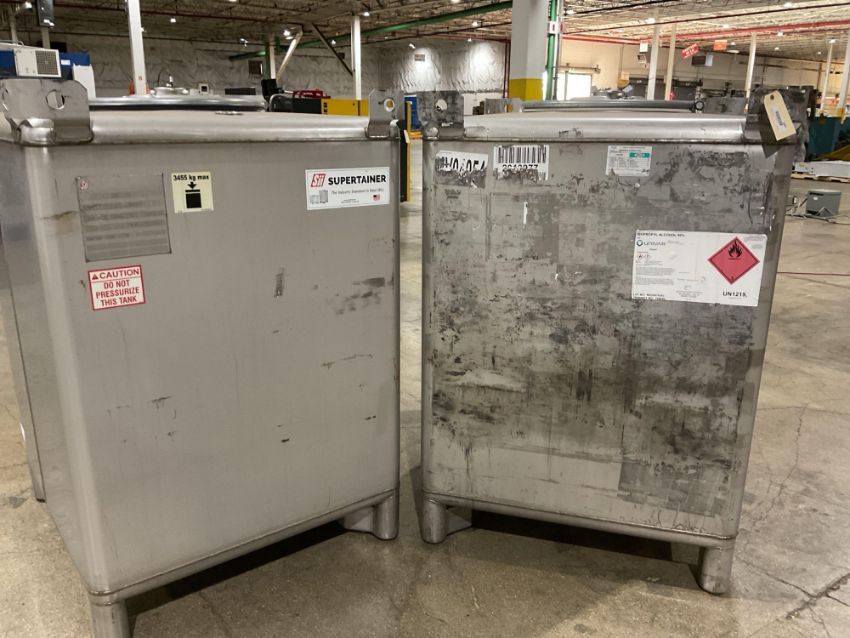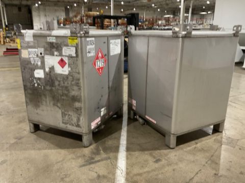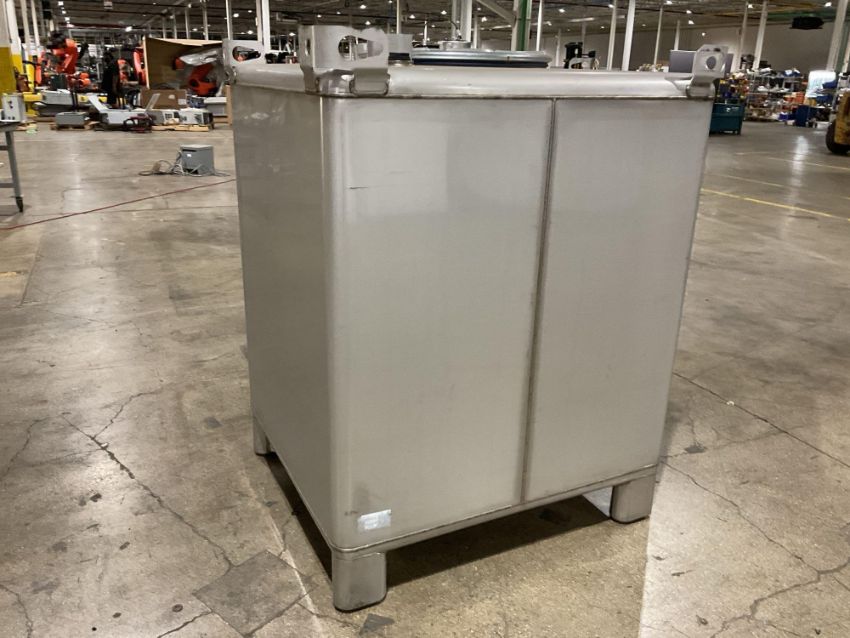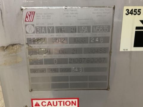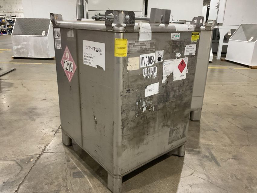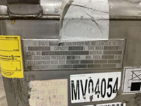 Snyder Industries stainless steel intermediate bulk container (IBC), Model M5835, with a total capacity of 1688 liters (approximately 446 gallons). Constructed from 304 stainless steel and designed for non-pressurized liquid storage and handling. Manufactured by Snyder Industries, Inc., Lincoln, Nebraska, USA.