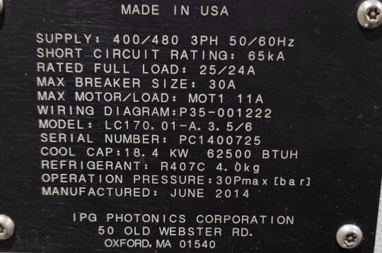 IPG Photonics LC170.01-A.3 laser chiller, 5/6 capacity model, engineered for high-efficiency thermal management of fiber laser systems. Compatible with 400/480V 3-phase electrical systems. Built for consistent cooling performance in demanding industrial environments. Model: LC170.01-A.3 Voltage: 400/480V Phase: 3PH Capacity: 5/6 Manufacturer: IPG Photonics Untested, Sold As-Is.