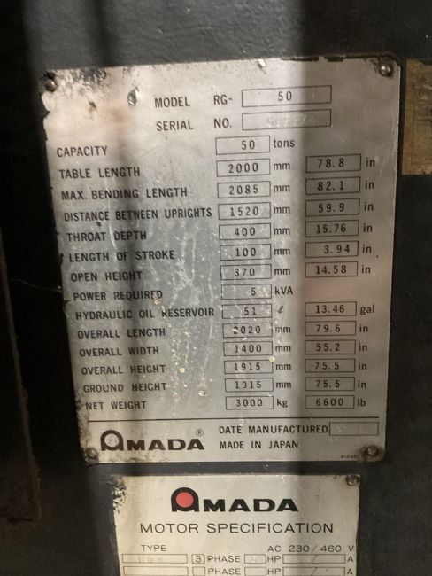 Amada RG-50 EX-II hydraulic press brake. Nameplate specifications as follows: